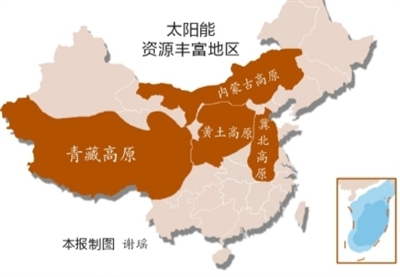 我国适宜太阳能发电的国土面积和建筑物受光面积很大,青藏高原、黄土高原、冀北高原、内蒙古高原等太阳能资源丰富地区占到陆地国土面积的三分之二,具有大规模开发利用太阳能的资源潜力。东北地区、豫、鄂和赣等中部地区,以及冀、鲁、苏等东部沿海地区太阳能资源比较丰富,可供太阳能利用的建筑物面积很大。在川、渝、贵、皖、湘等区域,也有许多局部地区适宜开发利用太阳能。