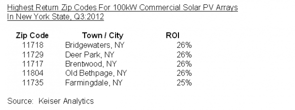 州内有逾80处运行中的公共电力设施,零售电价在每度0.03美元至0.30美元以上不等。在纽约,商用太阳能光伏可获得来自州内和电力部门的双重退款补贴。此外,还可获得联邦税务信用30%的优惠。在对邮编区域进行分析时,所有的这些变量都必须及时更新,并输入至能够准确地对潜在太阳能客户现有电力消费和安装太阳能阵列的成本与益处进行比较。