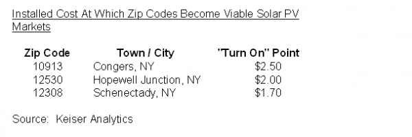 邮编区域为12530的“拐点”则为每瓦2美元。这一数值比现有安装成本(每瓦2.7美元)低25%。因此,这就意味着这一区域需要更长的时间来发展。在了解到这些数据之后,开发商/OEM企业应该为2013/2014年的这一市场制定相关策略。本着这种原则,通过获取全国各地区内太阳能光伏应用的拐点价格,或各州之内的拐点价格,公司能够据此制定出其未来多年的发展策略。