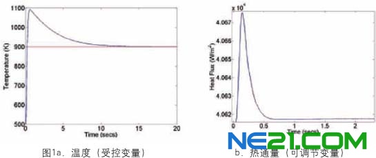 式中,k_I, k_T=100代表比例与积分常数。图1a和b显示用方程(1)将反应器顶部处工艺过程控制到设置点900K时,温度与热通量是如何变化的。