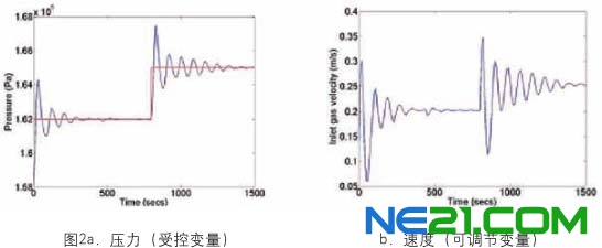 类似的PI控制器通过调节输入气体速度控制输入气体压力。图2为模拟研究的结果,此时我们用k_P=1x10-8和k_I=5x10-6。图2a显示了工艺过程对所需输入压力阶跃变化的响应,引起表面气体速度的变化(图2b)。