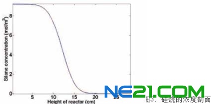 反应模块计算硅烷、氢、硅和形成的细粒子浓度与反应器高度的关系。在反应器高度上通过综合非均相反应和清除率,浓度剖面和细粒子形成速率决定了群体平衡模块所用的淀积速率。图3显示,硅烷及硅蒸汽浓度在反应器的入口处变化很快。浓度剖面中的初始平台是由于反应器入口的温度低。硅蒸汽浓度非常小,因为它不断进行均相成核。