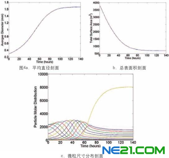 图4c显示,微粒尺寸分布的进展与时间的关系。图中的曲线代表尺寸间隔,它们显示出初始的生长,然后衰减到稳定状态。这是因为尺寸间隔(i-1)中的微粒生长填入尺寸间隔i中。但同时,微粒生长从间隔i填入间隔(i+1)中。因此,尺寸间隔(i-1)的质量首先开始衰减,接着是尺寸间隔i,如此等等。