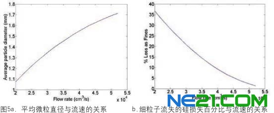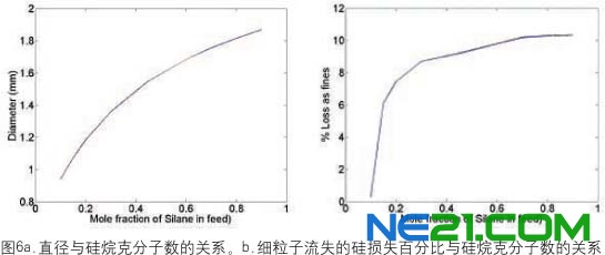 图6是平均微粒直径和细粒子流失百分比与馈入的硅烷浓度百分比变化的关系。可以看到细粒子流失造成较高的硅损失,这与过去的研究结果一致。