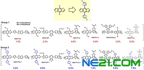 同时,研究人员还把强吸电子基团sulfonyl引入到聚合物PBDTTT中合成了PBDTTT-S,该聚合物具有较低的HOMO能级,基于PBDTTT-S的光伏器件PCE达到6.22%, 开路电压达到0.76 V(Chem. Commun. 2011, 47: 8904)。最近,他们通过插入噻吩p-桥和噻吩取代制备了二维共轭聚合物PBDTDTTT-S-T,该聚合物具有较好的平面结构和较强的链间相互作用,基于PBDTDTTT-S-T的聚合物太阳能电池的PCE最高达到7.81%(Adv. Mater., 2012, 24, 3383)。