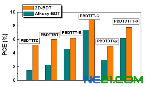 图2 含噻吩共轭支链的二维共轭聚合物与含烷氧基支链的非二维共轭聚合物光伏性能对比(青色——非二维共轭聚合物;橙色——二维共轭聚合物)