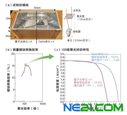 东京大学全球首次试制的是配备4个量子点型太阳能电池单元的模块。采用将12cm见方的聚光镜聚集的太阳光传递到5.5mm见方的各单元中的构造。台湾行政院原子能委员会核能研究所在105倍聚光状态下,测量到的模块转换效率为15.3%(图1)。