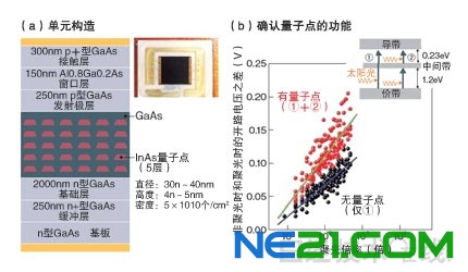 | 图2:形成5层量子点层 在GaAs基板上形成了5层InAs量子点层(a)。有量子点的模块增加了开路电压,确认了量子点的功能(b)。(图由本刊根据东京大学的资料制作) |