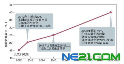计划通过追加二次聚光镜等在2015年之前使模块转换效率超过25%,2020年前后超过40%。要想超过40%,需要考虑进一步该如何改善,比如进一步增加量子点数量、在背面追加反射层、将母材变更为InGaP等来提高聚光倍率。其中,背面反射层目前正是实施准备实验。
