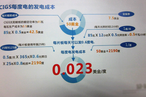第一,CIGS制造成本低,每瓦生产成本不超过0.6美元,通过展示发电测试,发电成本每度不超过0.023美元,而单、多晶硅片预估到2015年,每瓦成本达到1.2-1.5美元。