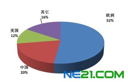 图1:中国9家主要光伏企业的销售收入和利润合计数据来源:企业财报,SEMI China从市场分布看,欧美市场依然是中国企业的主要销售区域,图2是部分中国光伏企业2011年的销售区域分布。(这些企业包括尚德、阿特斯、晶澳,赛维、天合、英利、中电、韩华、昱辉等)。