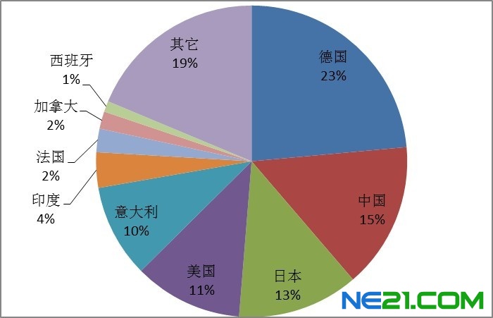 图2:2011年中国主要光伏企业的销售区域分布数据来源:SEMI China2012年全球光伏安装规模预计将略有提升,全年可望达到31GW。随着中国、美国、日本光伏市场的扩大,全球市场格局也将发生较大变化。全球各区域市场的比重如图3所示,作为传统光伏市场的欧洲各国所占比例将大幅下降,而中国、日本、美国所占的市场比重将进一步提高,预计分别达到15%、13%和11%。