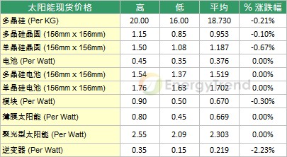 在现货市场的表现来看,目前正当中国十一假期,加上正逢展会期间,市场交易清淡,本周价格仅些微调整,唯一较为显著的反而是太阳能逆变器。在多晶硅方面,现货价格暂时止稳,平均价格小幅下滑到$18.73/kg,跌幅为0.21%;多晶硅晶圆方面,由于长假与产能调整的关系,近期交易清淡,本周多晶硅晶圆的平均价格来到$0.953/piece,小跌0.1%;单晶硅晶圆方面,部分厂商的报价仍然下跌,本周平均价格来到$1.187/piece,跌幅为0.67%。电池与模块方面,本周电池平均价格与上周相同;在模块方面,市场传出部分业者接到订单,市场观望后续发展,本周平均价格仅小幅下跌至$0.67/Watt,跌幅为0.3%。而在太阳能逆变器方面,由于需求转弱与竞争加剧,相关业者逐步调整价格策略,本周平均价格来到$0.219/Watt,跌幅为2.23%。