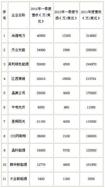 实际上,看一看在美国上市的众多国内光伏企业发布的2012年度第一季度财报,就已经是哀声一片了。受市场低迷态势影响,这些产值与市值曾经高达百亿的光伏企业,包括江西赛维、尚德电力、晶科能源、韩华新能源、英利绿色能源、昱辉光能、晶澳太阳能、常州天合光能、阿斯特太阳能和大全新能源,在境外上市光伏企业全部亏损。其中江西赛维亏损达1.85亿美元,尚德电力亏损1.33亿美元,晶科新能源亏损5660万美元,韩华亏损4820万美元,英利亏损4500万美元,昱辉亏损4020万美元,天合亏损2980万美元,阿特斯亏损2130万美元。