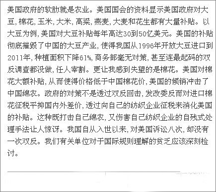 郎教授认为,美国最近对中国光伏一再发动反倾销,反补贴的双反调查,但是政府的对策令人失望,除了只会发布严正声明之外,几乎毫无对策。我呼吁痛打美国软肋,针对美国农产品进行双反调查。这种围魏救赵战略还可以强化我们在南海和钓鱼岛的谈判筹码。