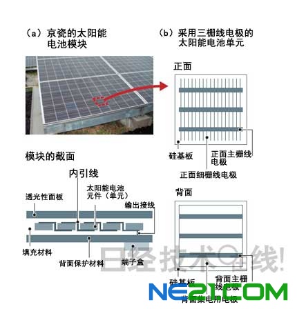 京瓷获得专利的三栅线电极构造是一种在结晶硅型太阳能电池单元的正面形成3条较粗电极的构造(图1)。与传统的2条主栅线(Bus Bar)的电极相比,除了可以降低电阻外,还可以增加采光面积、提高可靠性,因此“在日本国内视市场上流通的结晶硅型太阳能电池中,约六成都采用这种构造”(京瓷)。实际上,德国的Q-Cells和中国的尚德电力等海外知名厂商也在采用三栅线电极构造(图2)注2)。