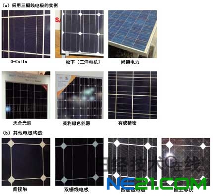 | 图2:各大公司都采用三栅电极 各大公司在展会等场合公开过的采用三栅电极的模块实例(a)。三栅线以外的电极构造包括背接触、双栅线、四栅线和自主形状等(b)。 |