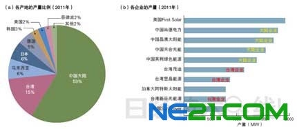 | 图1:中国大陆与台湾占产量的70%以上 在全球太阳能电池产量中,中国大陆与台湾之和占到了70%以上(a)。在产量前十之中,有7家是中国大陆和台湾的企业。(出处:根据美国NPD集团太阳能电池部门Solarbuzz的资料制作) |