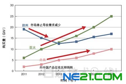 为了摆脱现在的困境,世界各地的太阳能电池企业都把目光转向了今后发展前景广阔的北美市场和亚洲市场。相对于即将从2013年开始逐渐减少采购量的欧洲市场,北美市场和亚洲市场预计将实现稳步增长。