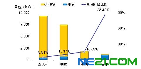 2011年日本与美国、德国、意大利市场住宅型太阳能发电比重比较