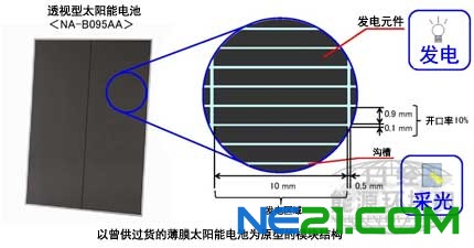 透明型太阳能电池的外形尺寸为1.4米×1.0米,厚度为9.5毫米。其结构是在3.9毫米的未强化玻璃与5.0毫米的强化玻璃之间夹入薄膜太阳能电池。1枚的重量为33公斤。通过在薄膜太阳能电池上设置沟槽,确保了10%的开口率。1枚的最大输出功率为95.0瓦。