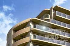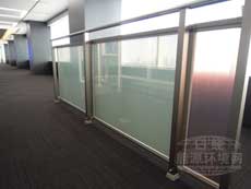 | 设置于高级公寓阳台护栏上的概念图。(资料:夏普) | 使用透明型太阳能电池的护栏示例。设置于夏普公司内部。(摄影:《日经建筑》) |