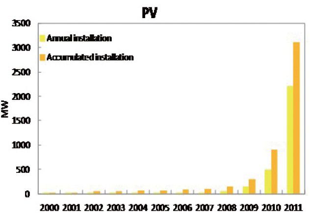 2000 年至2010 年, 在中国的能源结构中,光伏发电几乎可以忽略不计。据国家能源局统计,2011 年中国光伏发电装机容量达2.2 GW,累计总装机容量3.093 GW(如表1 和下页图1 所示),仅占中国总能源发电装机容量的0.2%左右。