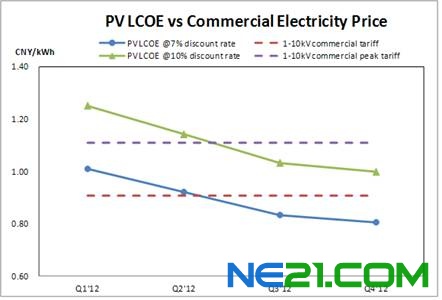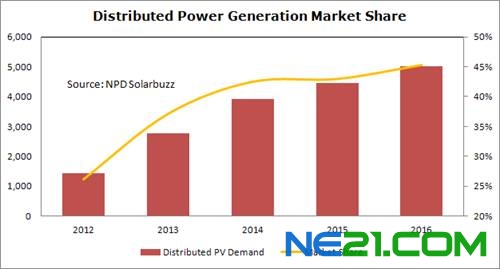 对分布式发电项目采用新的电价补贴标准之后,将可以大大提高可再生能源专项基金的资金利用率;另外根据NPD Solarbuzz亚太光伏市场季度报告的测算,基于不同地区的工商业电价水平和光照条件,中国大多数地区的分布式光伏发电的平准化上网电价(LCOE)会低于小规模工商业电价,同时考虑到未来电价的上升,分布式光伏发电的成本会越来越有竞争力。 NPD Solarbuzz预计在2013年中国分布式光伏市场的年增长率将超过90%,并将在未来几年中持续增长至每年5GW以上。