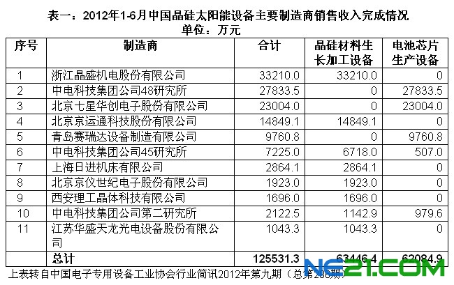 各主要制造商上半年完成的太阳能电池设备销售收入见表一。其中,浙江晶盛机电股份有限公司、中电科技集团公司48研究所、北京七星华创电子股份有限公司和北京京运通科技股份有限公司等四家公司上半年完成的太阳能电池设备销售收入共9.89亿元,占行业太阳能设备销售收入总额的78.8%。