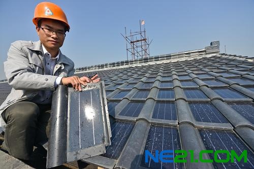 据新华社报道:11月14日,施工人员在展示一片安装在村民屋顶的“光伏陶瓷瓦”。这种高科技发电瓦片拥有多项专利技术,还获得2011年国家能源科技进步奖。从11月初开始,浙江省富阳市郊的洞桥村和三桥村两村已有17户村民家的楼顶上安装了光伏陶瓷瓦,并开始并网试运行,预计年发电量达11637度。这标志着由杭州市农村能源办委托富阳市供电局、浙江合大太阳能科技公司承建的“中国首例成片农村民居屋顶分布光伏并网发电系统”示范工程投入试运行。据介绍,光伏陶瓷瓦系统设计寿命为25年,每片光伏陶瓷瓦的发电功率约为每小时16瓦,以浙江的平均日照为例,50个平方的屋顶光伏陶瓷瓦一年可以产生4200多度电,足够普通家庭一年的用电量。按照6角钱一度电的价格算,可以节约电费7000多元。浙江是全国的光伏产业大省,目前嘉兴正在着力打造10平方公里的光伏产业创新园,嘉兴、绍兴两地还实施2万户家用光伏屋顶示范基地、推进和落实“百万光伏屋顶计划”。