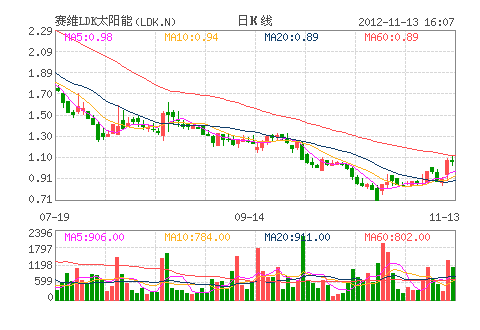 索比光伏网讯:最近,深陷破产传闻中的赛维LDK突然“复活”了。赛维ldk的股价在短短的几天内(11月7日和11月12日)两度暴涨,11月7日赛维LDK高开高走,截至收盘暴涨12.64%报0.98美元,成交量增至124万,11月12日,赛维LDK的股价再度冲上新高,最高价位达到1.10美元,暴涨20%。