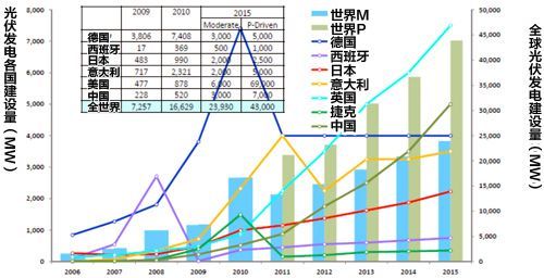 EPIA对2011年到2015年的装机容量进行了预测,低增长型预计年增长7.6%,政策指导型预计年增长21.5%。前者为2011年1333万千瓦,2015年2115万千瓦,后者则为2011年2393万千瓦,2015年4390万千瓦。