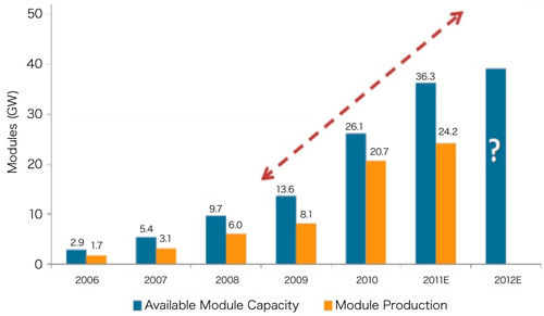 另一方面,以中国企业为主的积极投资还在继续,供应陷于过剩。第一太阳能公司的资料显示,世界的模块产量以8.1吉瓦(2009年)、20.7吉瓦(2010年)、24.2吉瓦(2011年)的速度推移,产能也从13.6吉瓦(2009年)逐渐增加到了26.1吉瓦(2010年)、36.3吉瓦(2011年)(资料3)。