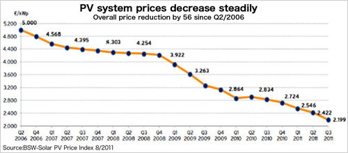 对于上面惊人的数字,大多数看法认为这是收购价格下调前的抢购需求(每半年修改一次收购价格),因为从基本上来说,家庭等建设方已经在电池板的价格大跌中获利。电池板价格下跌的速度要高于收购价格下调的速度。电池板价格在这1年间降到了2分之1,而系统价格在6年间下调了6成(资料5)。