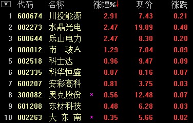 今日沪深两市小幅高开,之后沪指在昨日收盘点位附近维持窄幅震荡态势,深成指冲高回落,午后大盘回升乏力,沪指再度考验2000点大关。截止收盘,沪指报2008.92点,下跌8.06点,跌幅0.40%,成交333.7亿元;深成指报8052.79点,下跌7.75点,跌幅0.10%,成交336.7亿元。板块方面,今日太阳能板块小幅下跌,相关概念股涨少跌多,其中川投能源领涨,涨幅2.91%,三安光电领跌,跌幅3.20%。