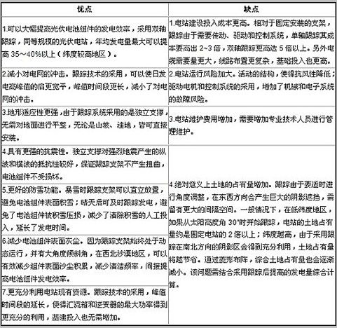 任何一种跟踪系统,必然有其优势和劣势,光伏电站是一个复杂的系统工程,在低成本高产出的前提下,运营商必须考虑跟踪系统的使用对其他事物的影响。光伏跟踪技术的基本优缺点介绍,如下表所示:
