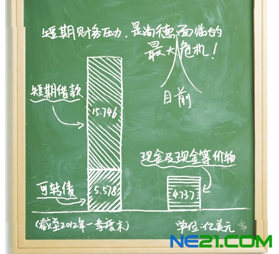 截至2012年一季度末,尚德总资产为43.786亿美元,总负债高达35.75亿美元(其中,短期借款15.746亿美元),负债率攀升至81.7%,而尚德手持的“现金及现金等价物”仅为4.737亿美元。更致命的威胁是,距今仅4个月后,2013年3月,尚德就必须支付5.578亿美元,以赎回其于2008年发行的可转换债券(可转债)。