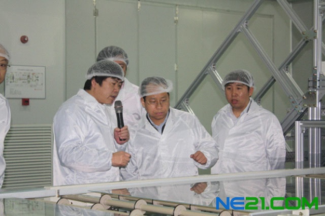 副市长一行首先到旭双公司生产车间进行了参观。在王甫民总经理的陪同下,张副市长一行首先深入生产一线,参观旭双公司整条生产线的运作流程,详细了解整个生产线的工艺技术,在了解到旭双公司的非晶硅薄膜太阳能电池生产是在整合国际前沿技术的基础上,通过自主研发、整合而形成的具有自主知识产权的高自动化、低成本、高效率、高良率的生产线,目前通过太阳能研究院专家、生产一线工程师、技术员等的刻苦专研,整线的生产工艺不断优化、良品率大大提高,已经顺利实现产品发货,走向市场时,张全明副市长对旭双能在短短半年多时间实现从投产到产品外销大跨越发展给予了高度的评价,并鼓励旭双继续保持高昂的战斗精神,抵制住光伏市场的“寒流”,迎来暖春。