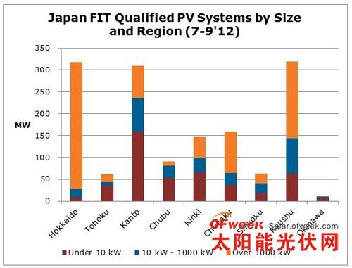 日本政府在今年7月开始实施全国上网电价。仅在7月到9月期间,就有接近1.5 GW的光伏项目申报并得到了补贴资格,占到了日本政府计划在2012年7月到2013年3月期间安装量的60%。在这1.5 GW的光伏项目中,规模大于1 MW的项目比例超过了50%。 具体到各个地区来看,九州岛地区获得补贴资格的项目总容量最多。 北海道地区获批的大型地面项目超过其他区域,主要得益于大量可利用的空地资源。而在人口密度相对较高的关东地区,核准的项目以小型屋顶项目为主。