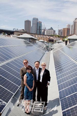 2010年11月26日,澳大利亚悉尼,施正荣和夫人张唯与好莱坞明星凯特·布兰切特和丈夫安德鲁·阿普顿站立于悉尼剧院屋顶,庆祝384千瓦尚德光伏系统顺利并网。