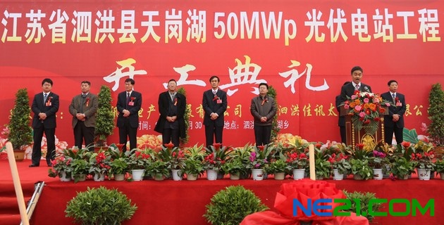 该工程是江苏省迄今单体最大的光伏发电项目。出席开工奠基仪式的有中共泗洪县委副书记、县长徐勤忠同志和四套班子领导、佳讯光电研究院院长,原中科院电工研究所所长李安定同志、佳讯光电董事长吕全亚先生,帮办单位县委办和发改局、天岗湖乡党委、政府等各级领导。