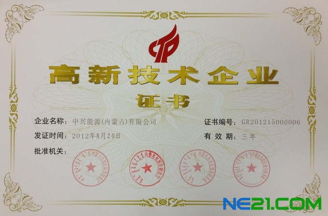中兴能源(内蒙古)公司获国家级高新技术企业荣誉称号