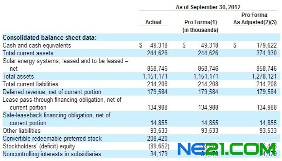 2012年前三个季度总营收1.03亿美元,较去年同期的3881万美元增长166.4%,其中来自运营租赁的营收3360万美元,同比增长109%,营收占比为41.5%;来自光伏系统销售收入6980万美元,同比增长207%,营收占比为58.5%。