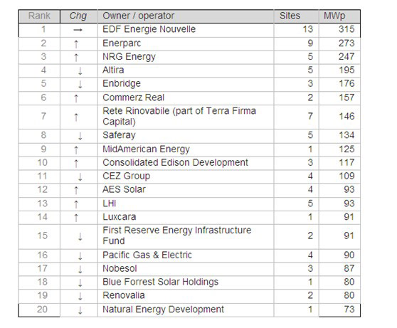 2010年以来排在首位的是法国电力公司EDF,而加利福尼亚州的公营Pacific Gas and Electric在其Utility Owned Generation (UOG)计划中也有一个产品组合。但是,名单包括更多独立电力生产商(IPP),如NRG能源公司、加拿大的Enbridge公司和意大利的Rete Rinovabile(RTR)。其他主要的商家是纯粹的金融投资者,包括沃伦·巴菲特旗下的MidAmerican Energy Holdings;和其他的太阳能项目开发商,他们保留了自己的项目组合,如Enerparc、Saferay和AES Solar。
