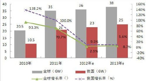 图2:2010-2013年全球及我国太阳能电池产量与增长