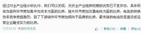 索比光伏网讯:今日,某资深光伏从业者在其微博上对目前国内光伏全产业链进行了分析。他认为光伏产业链中的光伏企业目前拼的不是规模优势,目前更重视拼细节、拼技术,企业更加注重专业化经营。
