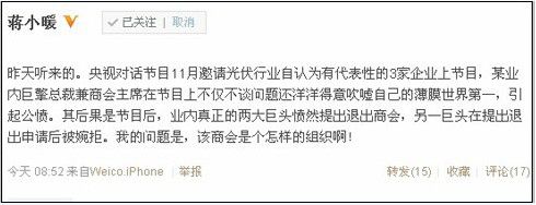 据微博“蒋小暖”随后爆料,某业内巨擎总裁兼商会主席在节目中不仅不谈光伏行业目前所面临的实际问题,而且却把话题放在大力吹捧自己的薄膜产能世界第一,薄膜电池技术的优越性等等,引起另外两位嘉宾的不耐烦与不满。而事件后果是,活动后,另两位嘉宾旗下企业愤然提出退出该商会,另位参加“对话”的某光伏巨头企业在提出退出该商会申请后被婉拒。