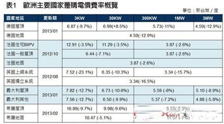 经过2012年的上冲下洗后,太阳能光伏市场的板块组合与景气浓淡出现结构性调整。首先,欧洲受到经济衰退的负面影响,加上欧元区外围成员国的财政困境逐渐蔓延至德、法等核心国家,整体欧元区经济基本面发展目前看来并不乐观。由表1可看出,欧洲各国在财政紧缩的压力下,持续调降低购费率(FIT),导致太阳能市场需求疲软,2012年欧洲市场占比将由2011年的75%衰退至51%,预估至2016年将进一步退缩至30%左右。