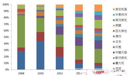 太阳能市场焦点转移也连带影响台湾太阳能产业出口比例,现阶段,输出至欧洲市场的比重已由以往超过50%,逐渐降至40%以下;相较之下,以美加为中心的美洲区域出口比例则大幅提高,成为台商新的出口亮点市场。此外,东南亚与印度的出口占比也显着提升,主因在于印度、马来西亚等国具备良好日照条件,2012年以来受惠于政策利多与系统价格跌深的激励,内需规模明显扩大。