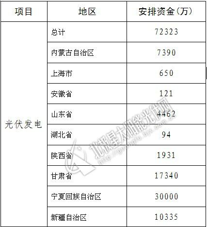 索比光伏网讯:(记者袁慧珍)据悉,财政部于12月19日下发《关于预拨2012年可再生能源电价附加补助资金的通知》(以下简称《通知》)。《通知》指出,2012年全国可再生能源电价附加补助资金共计859752万元。其中太阳能光伏发电项目安排资金72323万元。